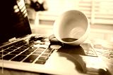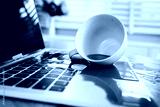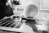 Morning mishap: hot coffee spills over office laptop and documents on a desk, causing wet stains, electronic hazard, and frustration.