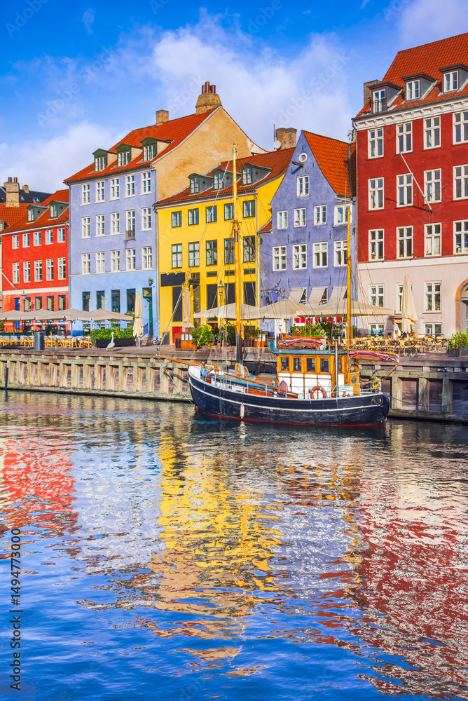 Copenhagen, Denmark. Vibrant harbor of Nyhavn, colorful buildings and boats.