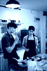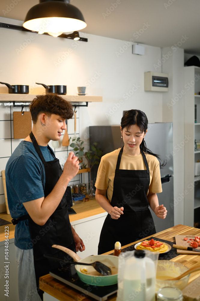 Young couple enjoying cooking together and creating a beautifully plated breakfast