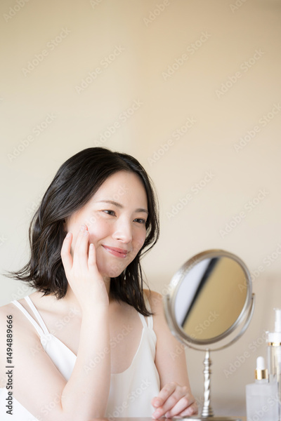 鏡をみる素肌感が美しい若い女性の美容やビューティーイメージクローズアップ ベージュや黄色背景