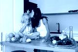 Smiling young mother cooking and spending time with her child in a bright modern kitchen. Lifestyle series about healthy food, family moments, love, and wellness at home.