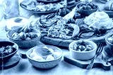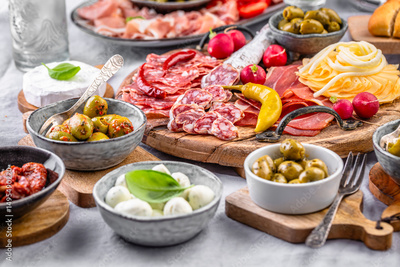 Assorted appetizers and antipasti platters on wooden tray, catering concept with meats and cheese