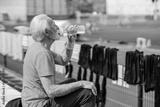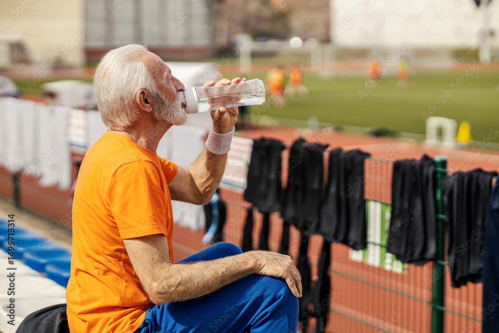 An old sportsman sitting on stadium and drinking water.
