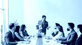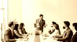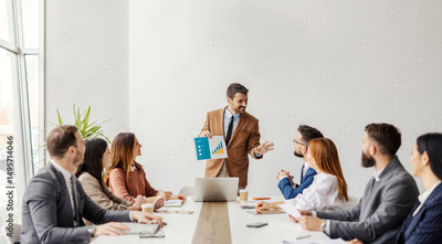 An executive standing and showing chart with financial report to his team of experts at boardroom.