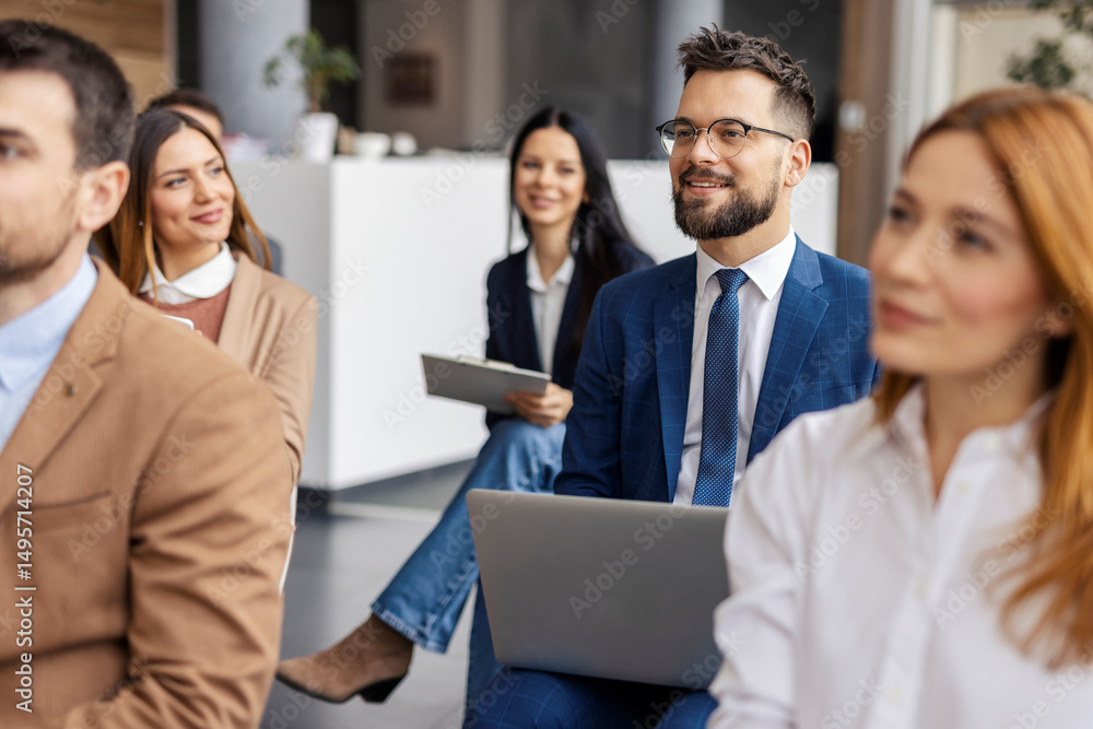 Portrait of businessman sitting in auditorium with laptop during seminar and following lecture.