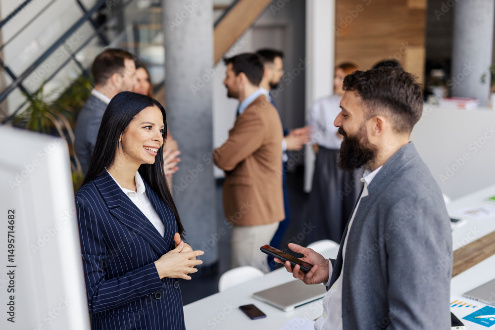 Young businesswoman standing with her colleague at corporate office and discussing.