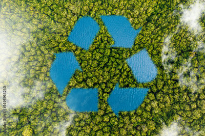 Recycled signage concept amidst the natural beauty of the natural environment. Ecological metaphor for ecological waste management and sustainable and frugal lifestyles. Recycle symbol lake.