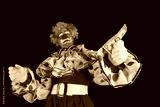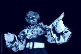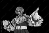 Funny clown with one dollar. Man entertainer as Joker in a suit and wig, with clown whiteface makeup. Trickster, jester, pantomime, mime, and a professional actor at events