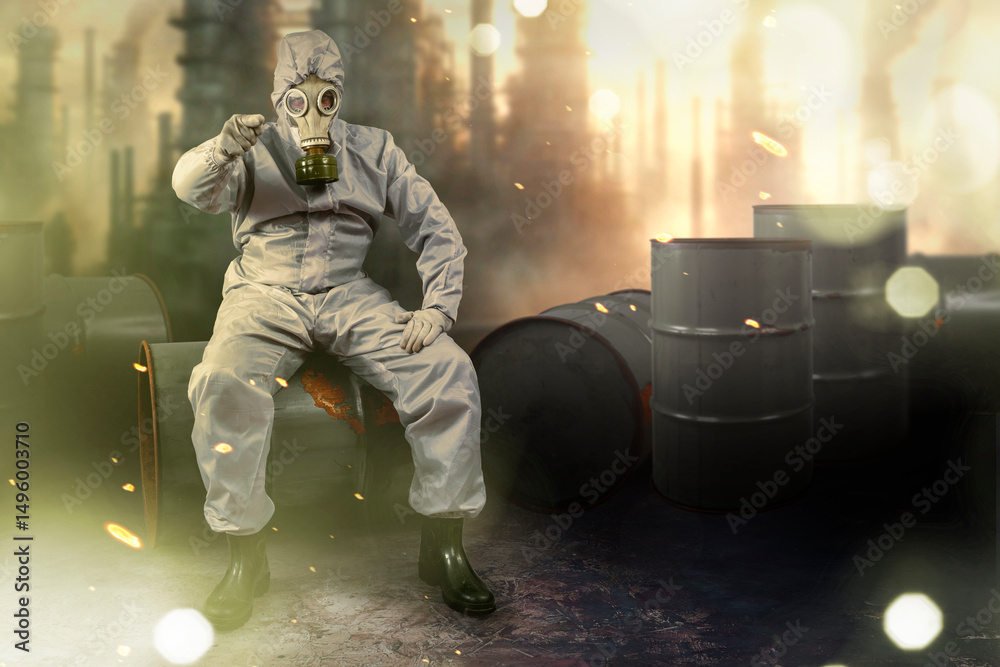 A man in a gas mask and protective suit sitting on a barrel of chemical waste and pointing at the camera. Environmental pollution concept. Dirty air with dust and noise, grunge effect.