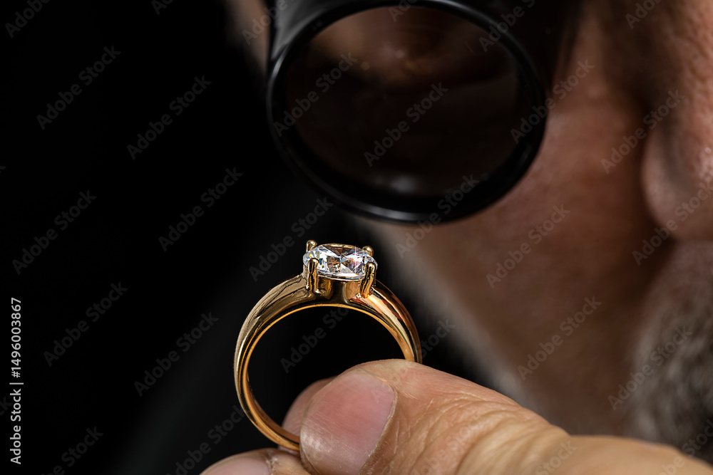 Jewelry appraiser examines a gold ring evaluating large diamond looking through magnifying glass monocular. Professional goldsmith manufacturing or repair luxury wedding engagement ring