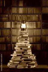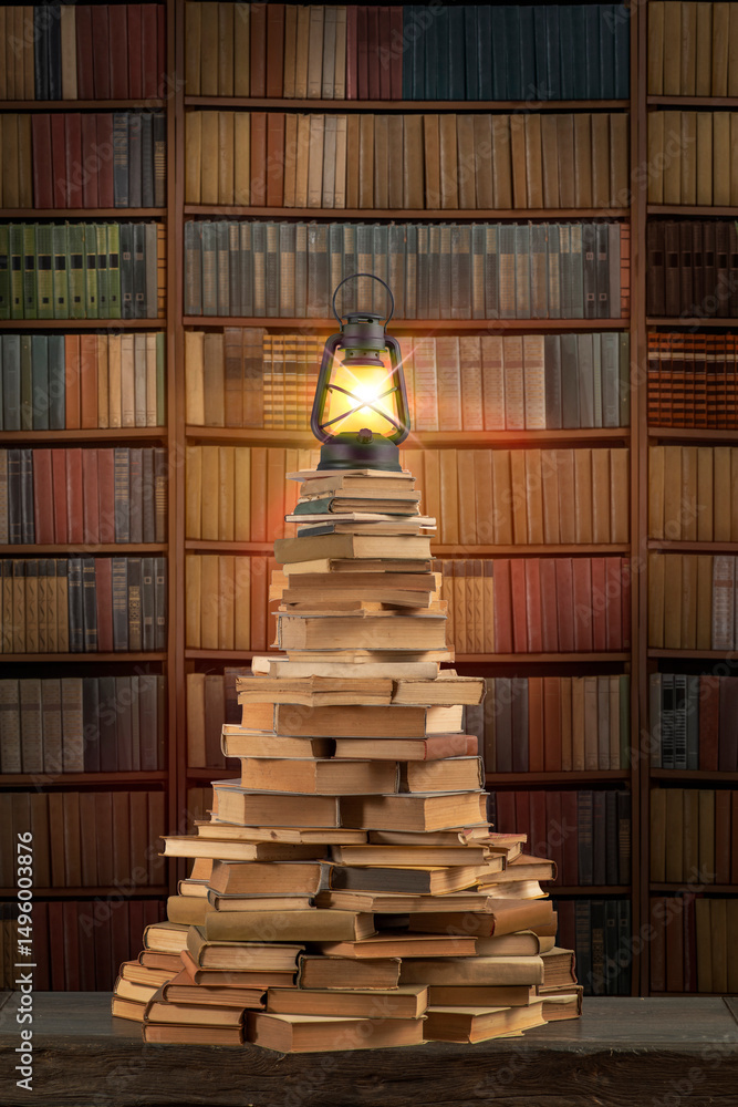 Stacks of books, lantern against the bookshelves. Concept of learning, library, reading, old classical literature