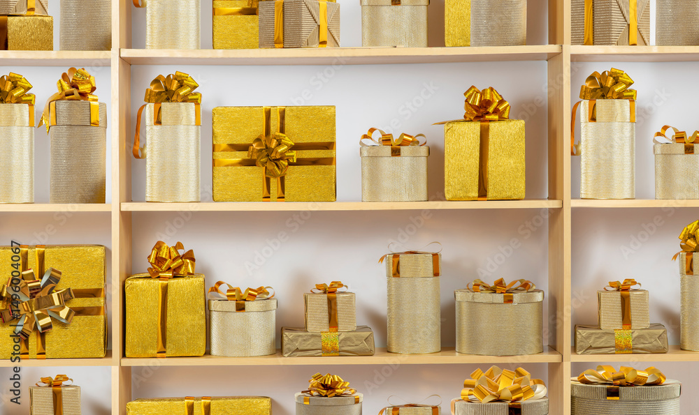 Golden gift boxes for holidays, birthday, promotions, christmas, new year, wedding. Elegant luxury wrappers, lush bows on a shelfs.