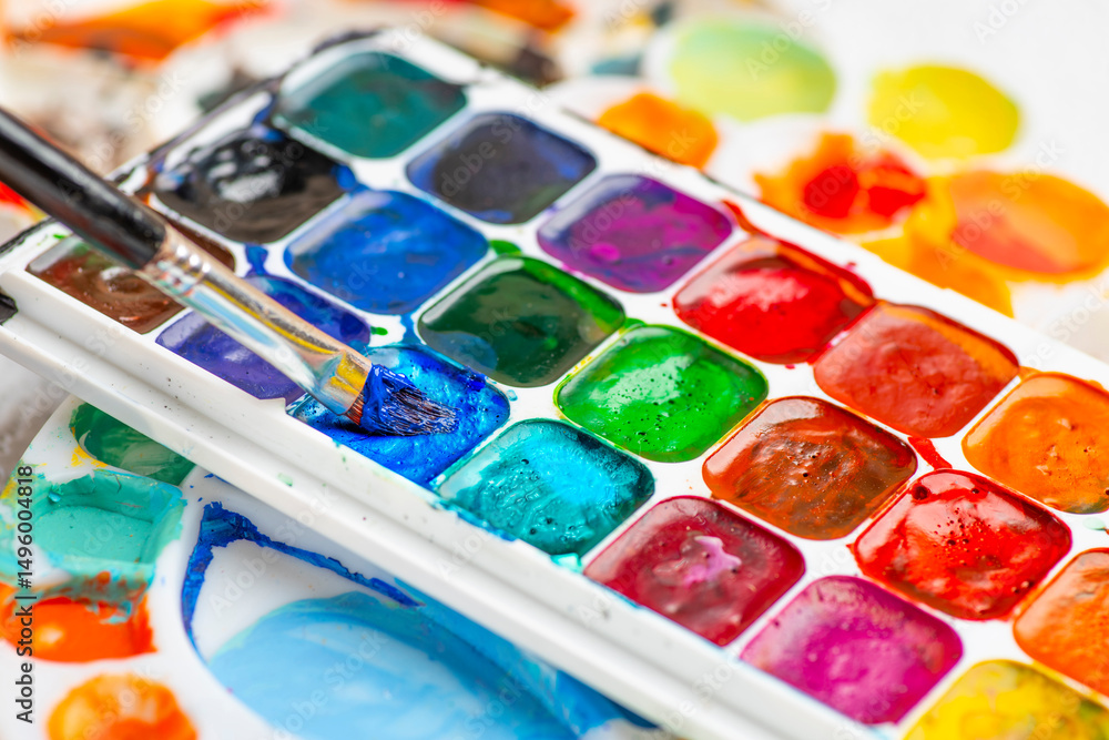 Watercolor paint in old used plastic palettes, brushes, creative mess