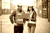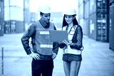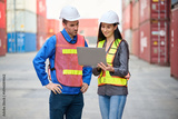Engineers or workers using laptop computer and talking about work in containers warehouse storage