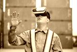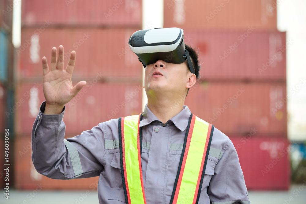 Engineer or worker wearing virtual reality glasses(VR) in containers warehouse storage