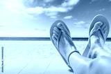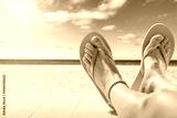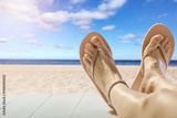 Bare Feet in Flip-Flops on Wooden Deck by the Beach – Summer Vacation and Relaxation Concept. Copy space for product. Peaceful summer vacation scene, evoking relaxation and sunbathing.