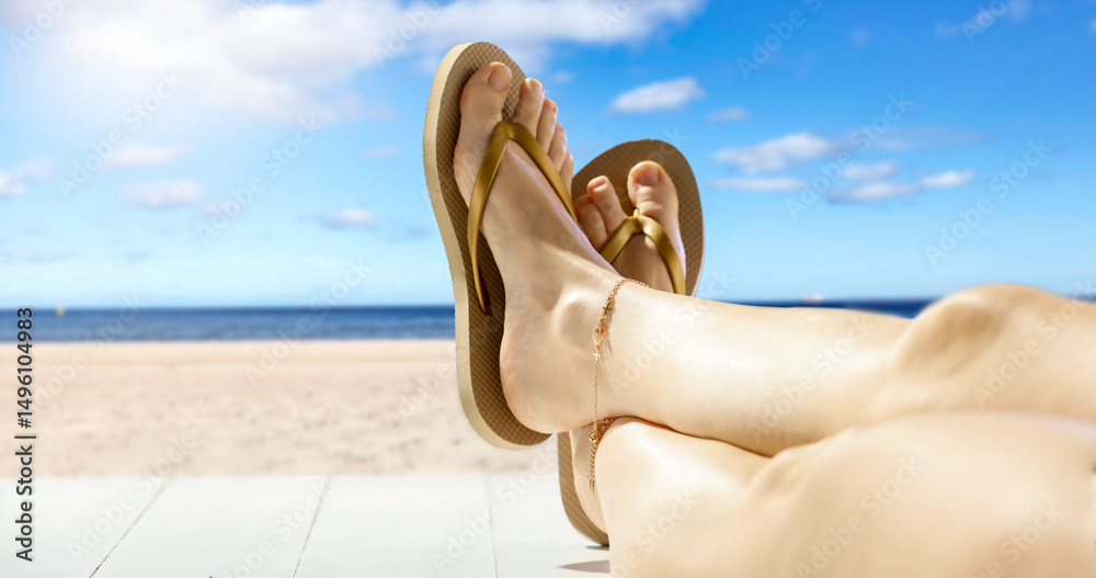 Bare Feet in Flip-Flops on Wooden Deck by the Beach – Summer Vacation and Relaxation Concept. Copy space for product. Peaceful summer vacation scene, evoking relaxation and sunbathing.