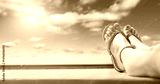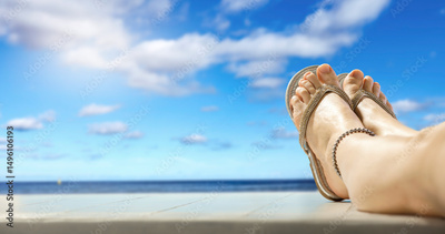 Bare Feet in Flip-Flops on Wooden Deck by the Beach – Summer Vacation and Relaxation Concept. Copy space for product. Peaceful summer vacation scene, evoking relaxation and sunbathing.