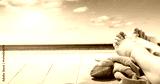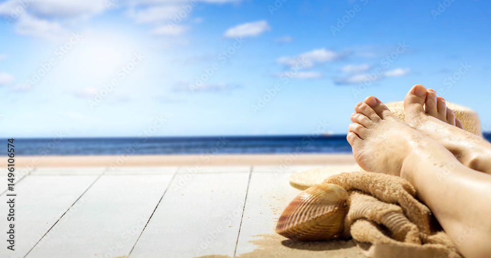 Bare Feet in Flip-Flops on Wooden Deck by the Beach – Summer Vacation and Relaxation Concept. Copy space for product. Peaceful summer vacation scene, evoking relaxation and sunbathing.