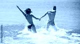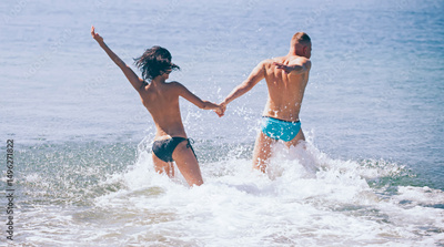Couple in love enjoying summer beach moment. Romantic travel by summer sea beach. Couple on tropical summer vacation. Beautiful couple love rest on the beach. Couple in summer paradise.