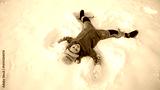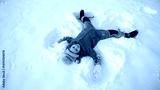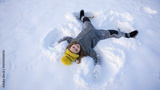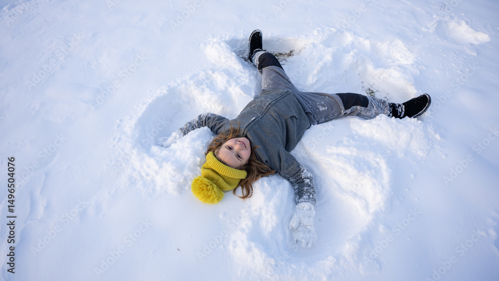 Child making a snow angel. Happy kid lying in the snow. Kid angel in snow. Winter kids with snowy angel wings. Smiling child on a snowy day. Carefree kid in the snow lake angel. Marry Christmas.