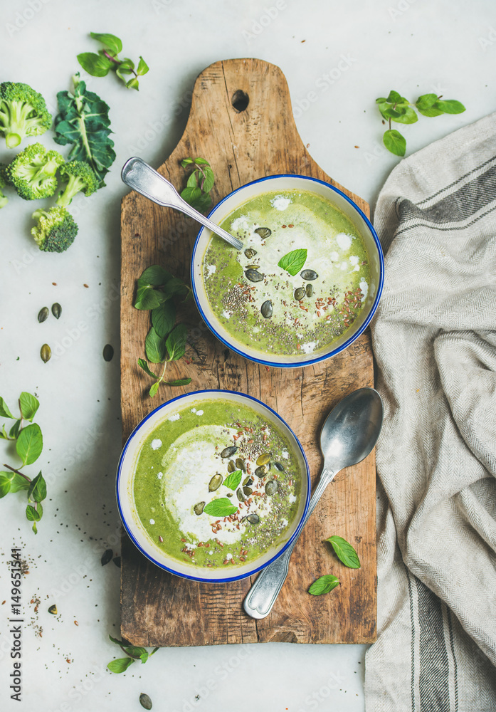 Spring detox broccoli green cream soup with mint and coconut cream in blue bowls on rustic wooden board over marble background, top view. Clean eating, dieting, vegan, vegetarian, healthy food concept