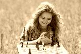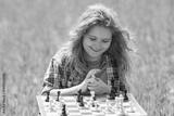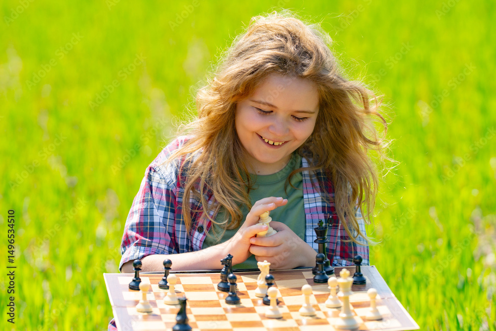 Kid plays chess. A clever cute child thinks and playing chess. Kid focuses on chessboard. The child make checkmate. A smart kid plans chess. Child sits on grass enjoys chess. The board logic game.