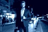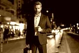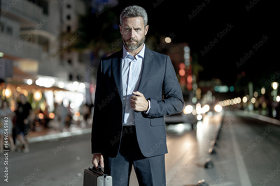 Businessman with briefcase walking at night city. Rich man in suit in city. Businessman near luxury car. Businessman walking near night city lights. Business style. Rich businessman in luxury setting.