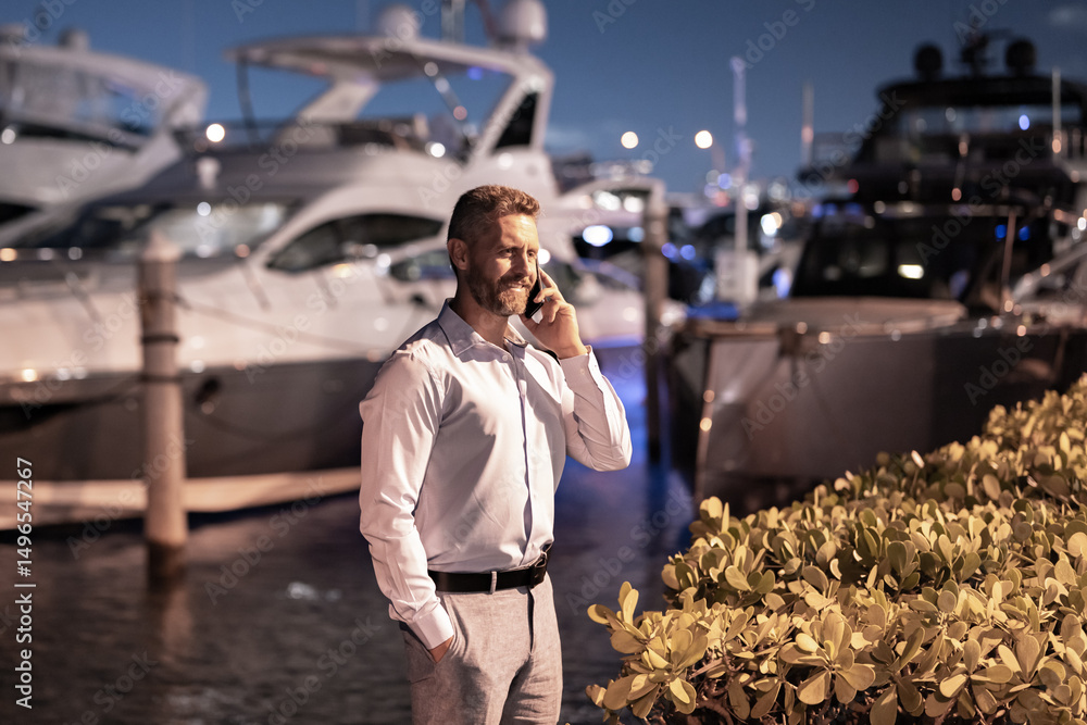 Rich businessman near yacht. Wealthy man enjoying luxury yacht. Millionaire or Billionaire lifestyle. Rich man on a private yacht. Financial freedom. Expensive yacht with a successful businessman.