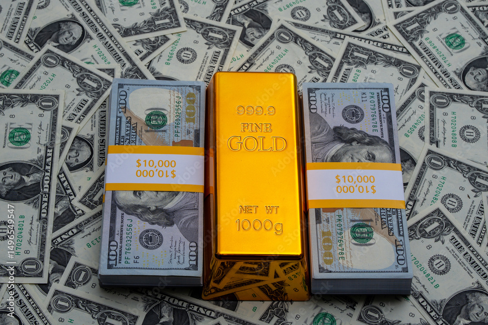 Gold bars. Dollar bills with gold bars. Cash money. Finance and banking concept. Golden bullion. Hundred dollar bills and Gold bars. Treasure chest with currency. Earning money in Gold.