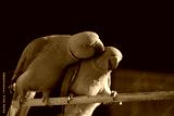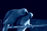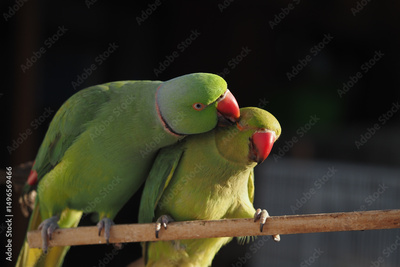 Colorful parrots interacting on a branch in natural habitat