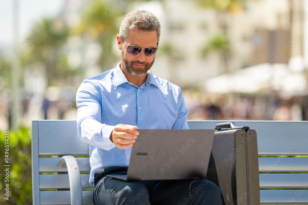 Confident businessman sitting on a bench with a laptop and phone in park. Rich businessman. Mature businessman enjoying work break. Businessman taking a break on a park bench. Urban business.