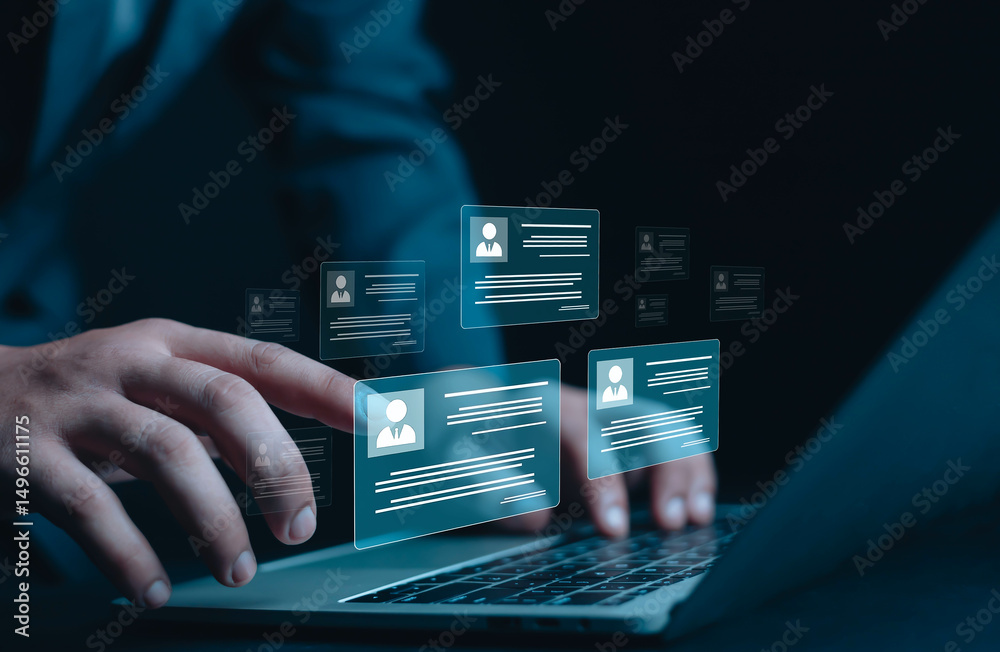 Businessman showing concept of human resources, employees, employment, management, training, HR, technology, business leadership concept, consulting, customer concept, digital service.