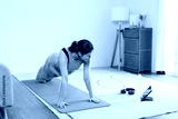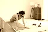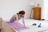A woman practicing yoga indoors, performing the upward-facing dog pose on a black yoga mat. The room has wooden floors and other yoga mats and props are visible in the background.