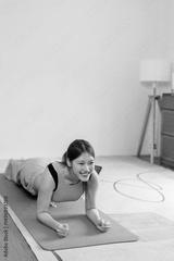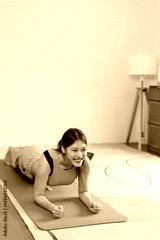 A woman practicing yoga indoors, performing the upward-facing dog pose on a black yoga mat. The room has wooden floors and other yoga mats and props are visible in the background.