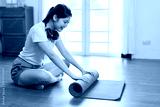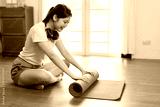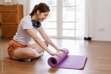 Woman hands rolled up yoga mat on gym floor in yoga fitness training at room Home