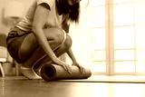 Woman hands rolled up yoga mat on gym floor in yoga fitness training at room Home