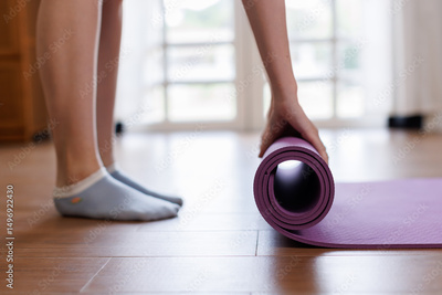 Woman hands rolled up yoga mat on gym floor in yoga fitness training at room Home