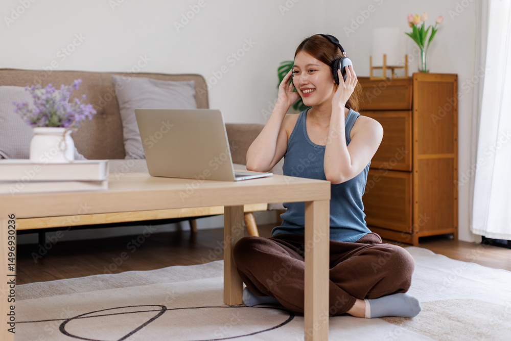 Young asian woman wearing headphones and works taking notes on a Laptop while participating in a video conference on her laptop at home