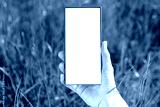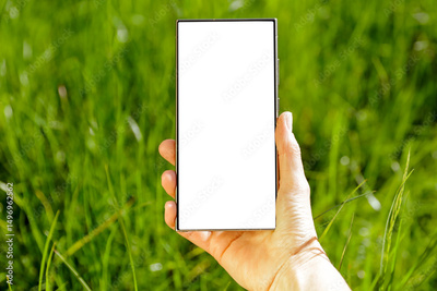 Smartphone with blank screen with space for text on natural green garden background with grass and natural leaves in daylight.