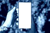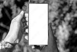 Smartphone with blank screen with space for text on natural green garden background with grass and natural leaves in daylight.