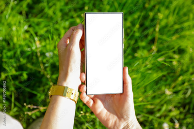 Smartphone with blank screen with space for text on natural green garden background with grass and natural leaves in daylight.