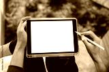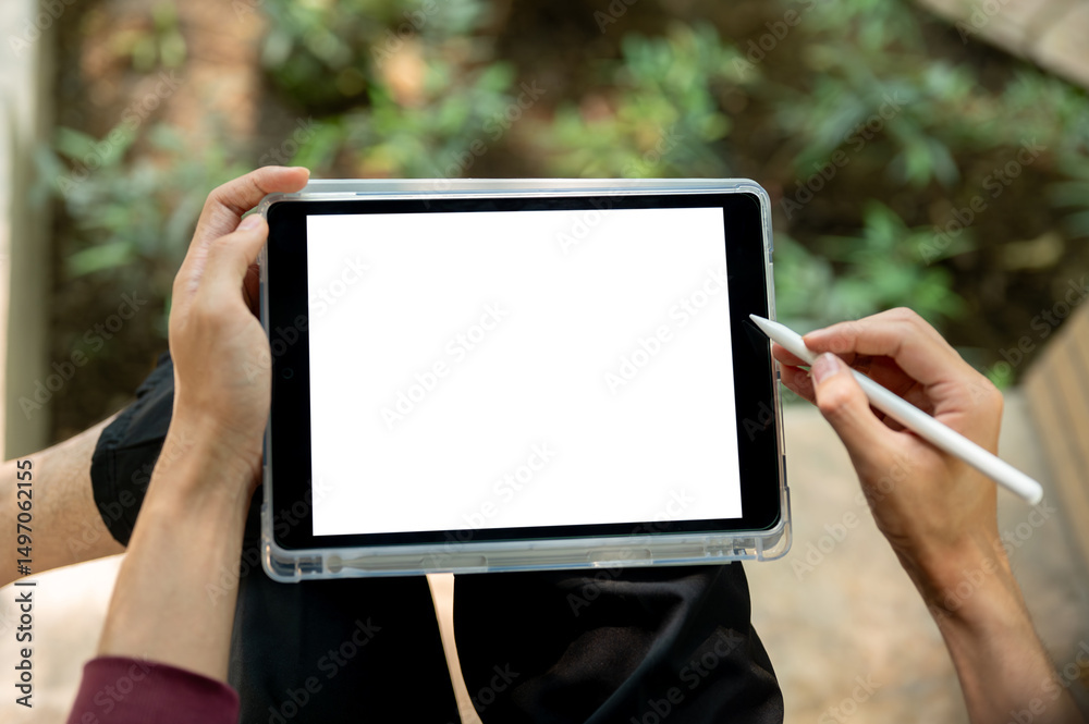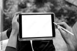 Top view of a hand holding white screen tablet and stylus pen while sitting cross legged near plant bed.