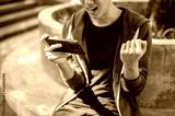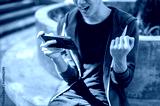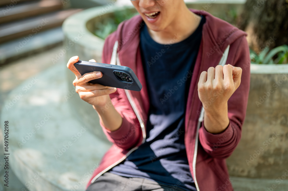 Asian man watching video or playing game on smartphone and making a fist while sitting in the park.