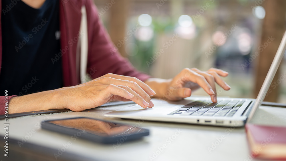 Close up of both hand touching and typing on laptop next to a phone while sitting at concrete table.