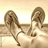 Bare Feet in Flip-Flops on Wooden Deck by the Beach – Summer Vacation and Relaxation Concept. Copy space for product. Peaceful summer vacation scene, evoking relaxation and sunbathing.
