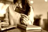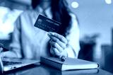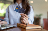 Blue shirt woman holding or showing a credit card while sitting with laptop at wooden table in cafe.