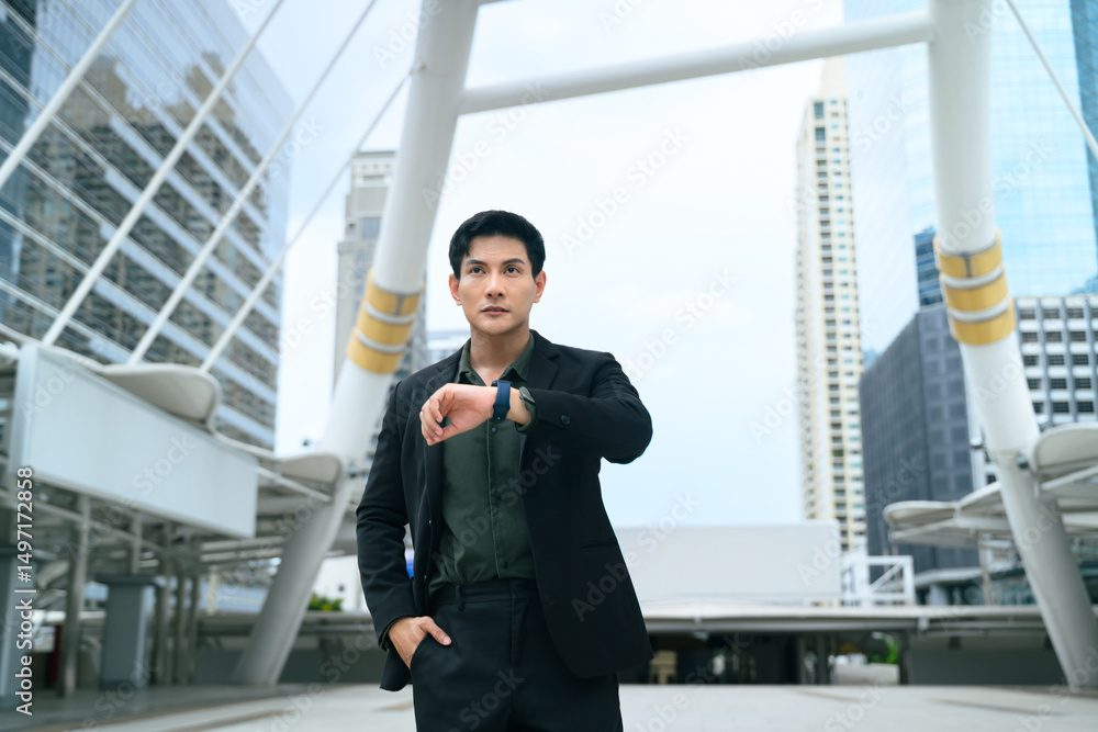 Confident businessman in a black suit looking at his smartwatch while standing in a modern urban