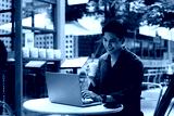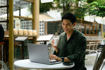 Handsome male freelancer using laptop and sipping coffee in a relaxed outdoor workspace