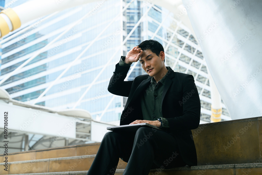 Male worker in businesswear displays signs of burnout or fatigue in an urban environment